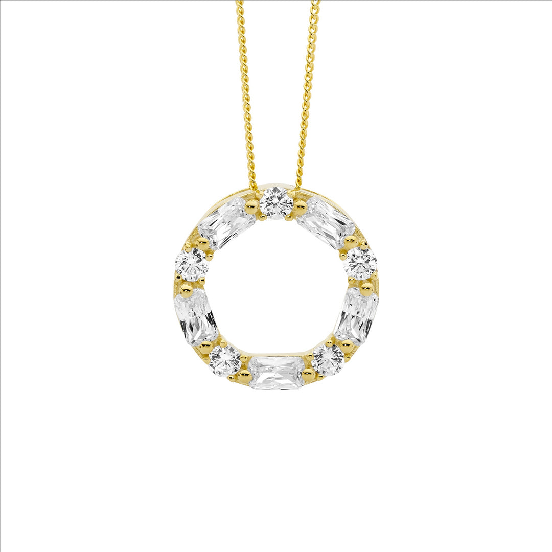 SS WH CZ round & baguette 18mm circle pendant w/gold plating